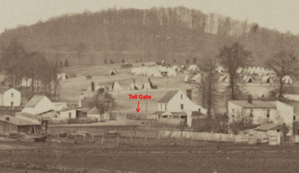 The road rolling up and down between the two hills is the rustic Bladensburg Turnpike. Although the definition is a bit lost today, a turnpike was originally a toll road, and Bladensburg Pike fit the definition, with a toll gate at the intersection where there was a small cluster of houses, as you can see on the map. The 7th Street Turnpike, today’s Georgia Avenue, was also a toll road.