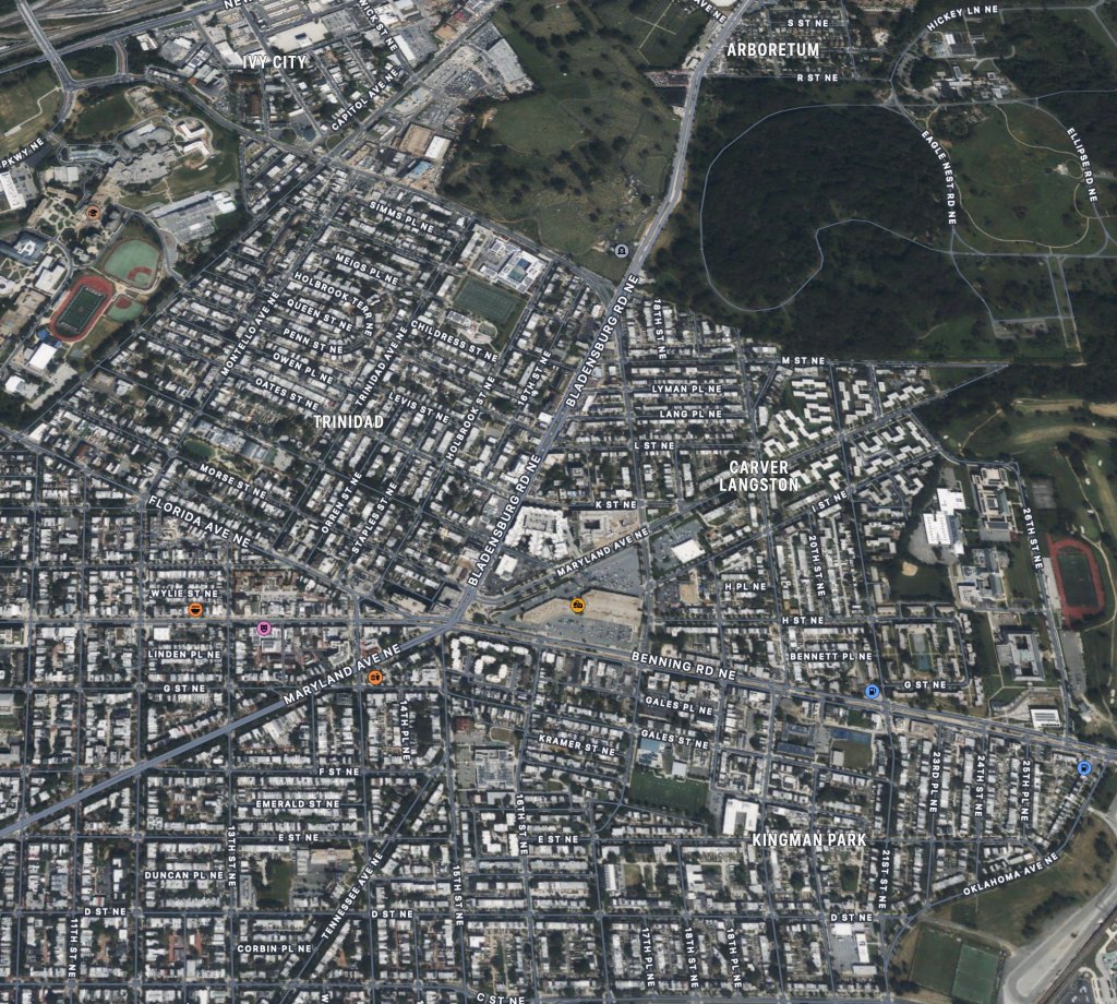 You can see from the photograph and the map just how sparsely populated the eastern part of the District was at that point. There were some houses along Maryland Avenue and H Street, but a lot of open scrub as well. But it wouldn’t take long after the Civil War for the District’s population to explode, and all those empty places would soon be filled in. Here’s what it looks like today: