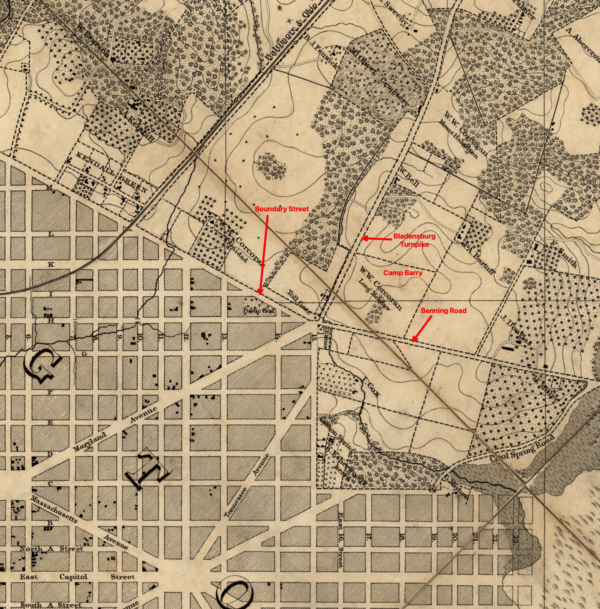 Camp Barry was located on a tract of land owned by W.W. Corcoran and called Long Meadow. It lay at the intersection of six streets – Boundary Street (Florida Avenue), H Street NE, Maryland Avenue, 15th Street NE, Benning Road, and the Bladensburg Turnpike, which today we call Bladensburg Road. Here is that intersection in 1861: