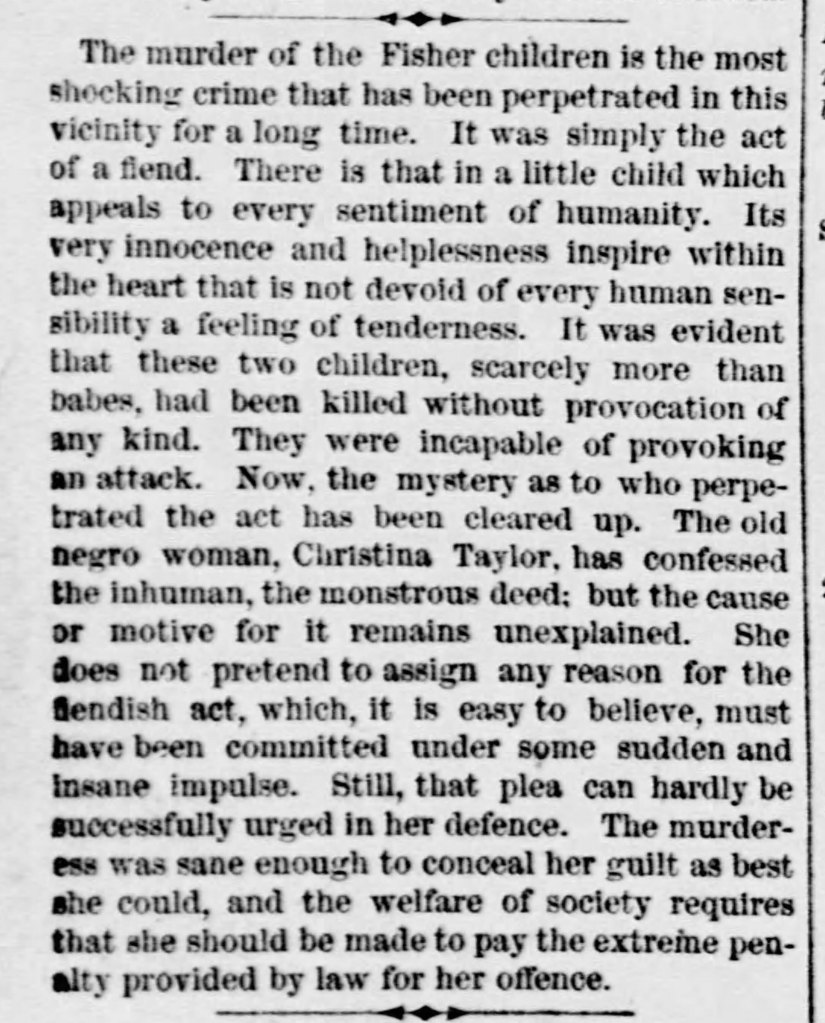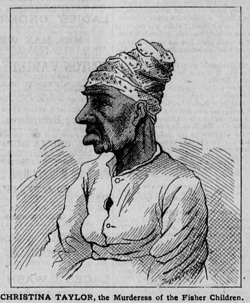 “They seem to be going to let Christiana Taylor die on our hands,” remarked Capt. Russ as the round of inspection was about concluded. “Not that she is ailing at all, but she must, in course of time, die of old age, and there does not seem any prospect of her being hanged. She was committed here over three years ago for the cruel murder of two white children named Fisher, in the county, tried, and convicted, but she seems to have been forgotten.”