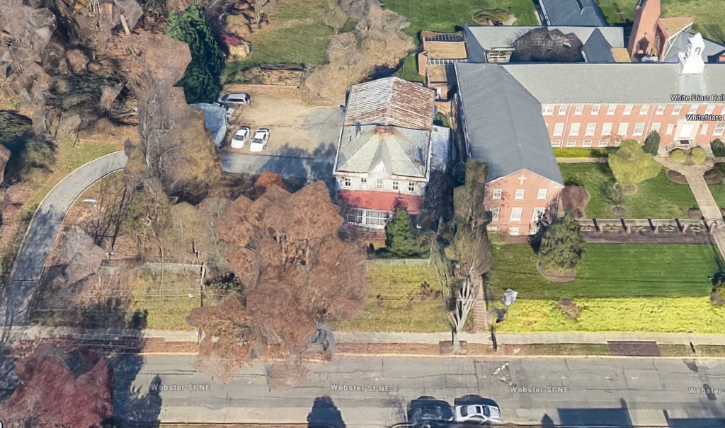 The farm property was eventually sold to the Carmelite Fathers, who built their Whitefriars Hall there, at what is now 1600 Webster St. NE. They kept the original farmhouse and used it for offices and storage. Surprisingly, though it was built before the Civil War, it survived until 2016, when it was razed. Google’s satellite view of the area was obviously taken before that time, as the farmhouse is still visible.