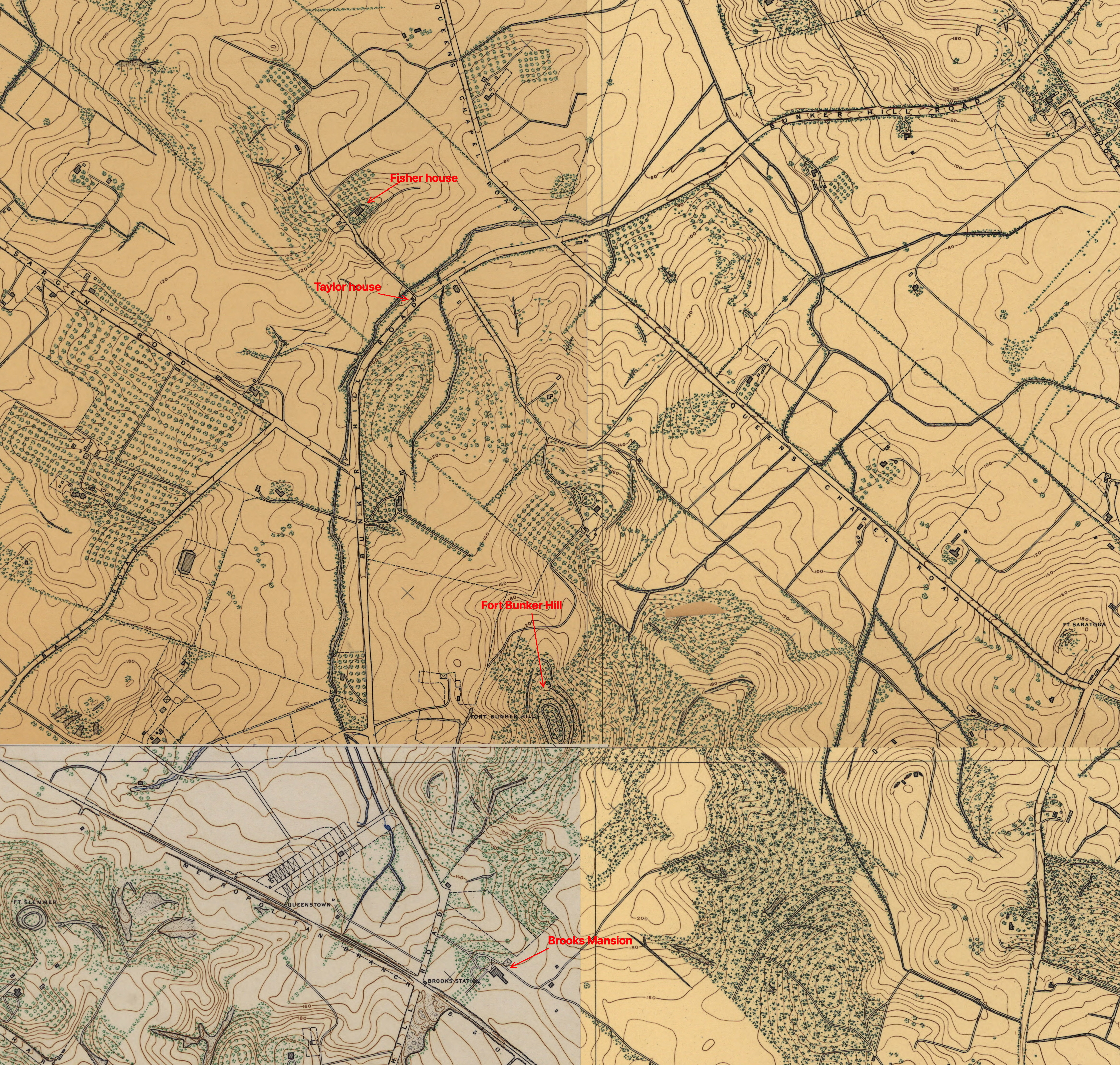 To get you oriented, here is a map from the era, showing the Fisher and Taylor homes, as well as Fort Bunker Hill and the Brooks mansion.