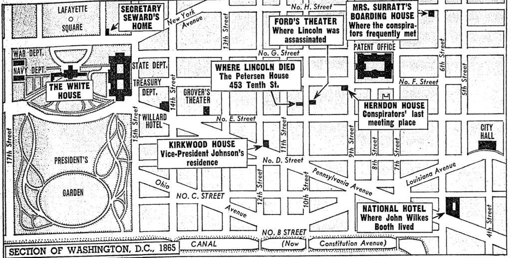 Here’s what we do know. On April 14th, at about 10pm, Lewis Powell left his room at the Herndon House, right around the corner from Ford’s Theater. The four primary conspirators, John Wilkes Booth, David Herold, George Atzerodt, and Powell had had their final planning session at the Herndon House just a little earlier. Booth would kill Lincoln, Powell would kill Seward, and Atzerodt was supposed to kill Vice President Johnson at the Kirkwood Hotel, though he demurred, to Booth’s anger. This map shows the various downtown locations involved in the conspiracy: