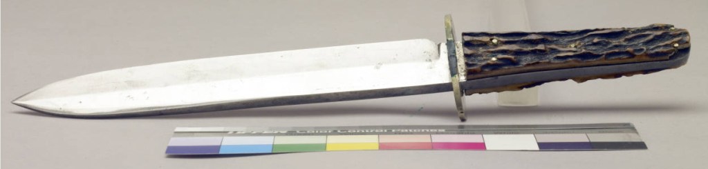 He stabbed repeatedly at Seward’s face, but the knife was deflected by the Secretary’s jaw brace so he was cut in the cheek on right side of his face and his neck on the left side. Pvt. Robinson then jumped on Powell, trying to wrestle him away. Powell hit him with the butt of his gun, dropped it, then slashed at him with the knife. The two continued fighting when Augustus Seward, the Secretary’s oldest son, ran into the room after hearing the yells and screams. He tried to maneuver the wrestling pair back out to the hallway. Powell managed to get free, ran out the bedroom door yelling “I’m mad! I’m mad!” and started down the stairs. There he ran into a clerk from the State Department who was delivering a message. Powell stabbed him deeply in the back and burst out the front door. He had left a bloody trail of violence behind him, though all of those he attacked would survive.