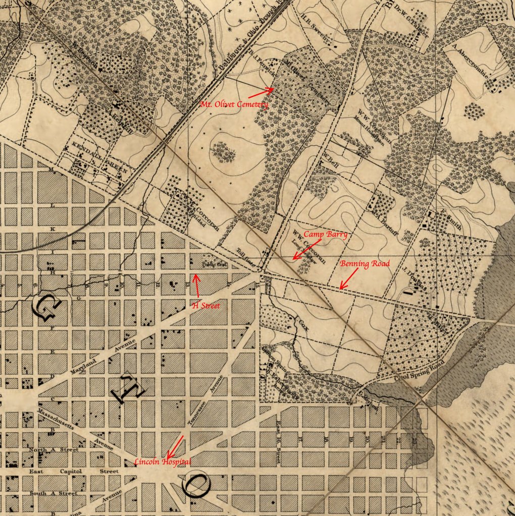 Where was Powell planning to go after his attack on Seward? Many speculated he intended to meet up with Booth and Herold in Southern Maryland, and cross over the Potomac into Virginia with them. But Powell had been in Mosby’s Rangers, who after an action tended to “skedaddle” in different directions to throw off any pursuers, and that seems most likely here as well. Powell later indicated he was heading to Baltimore, where he had friends and a network of Confederate safe houses. Either way, he was not aiming for the Navy Yard bridge that Booth and Herold took. Far more likely is that he was heading to the Benning bridge to cross the Eastern Branch (Anacostia River). The easiest way to get there was to go straight across the city on H St, which ran into Benning Road. Powell may not have realized that the bridge was closed off after 9pm, and he would have to talk his way past the guard if he expected to cross the river. Nonetheless, after racing across the city, it appears he got close to the intersection with Benning Road when his horse stumbled and threw him, perhaps knocking him briefly unconscious. The horse limped away, to be discovered shortly afterward about a half mile away on the road to Camp Barry.