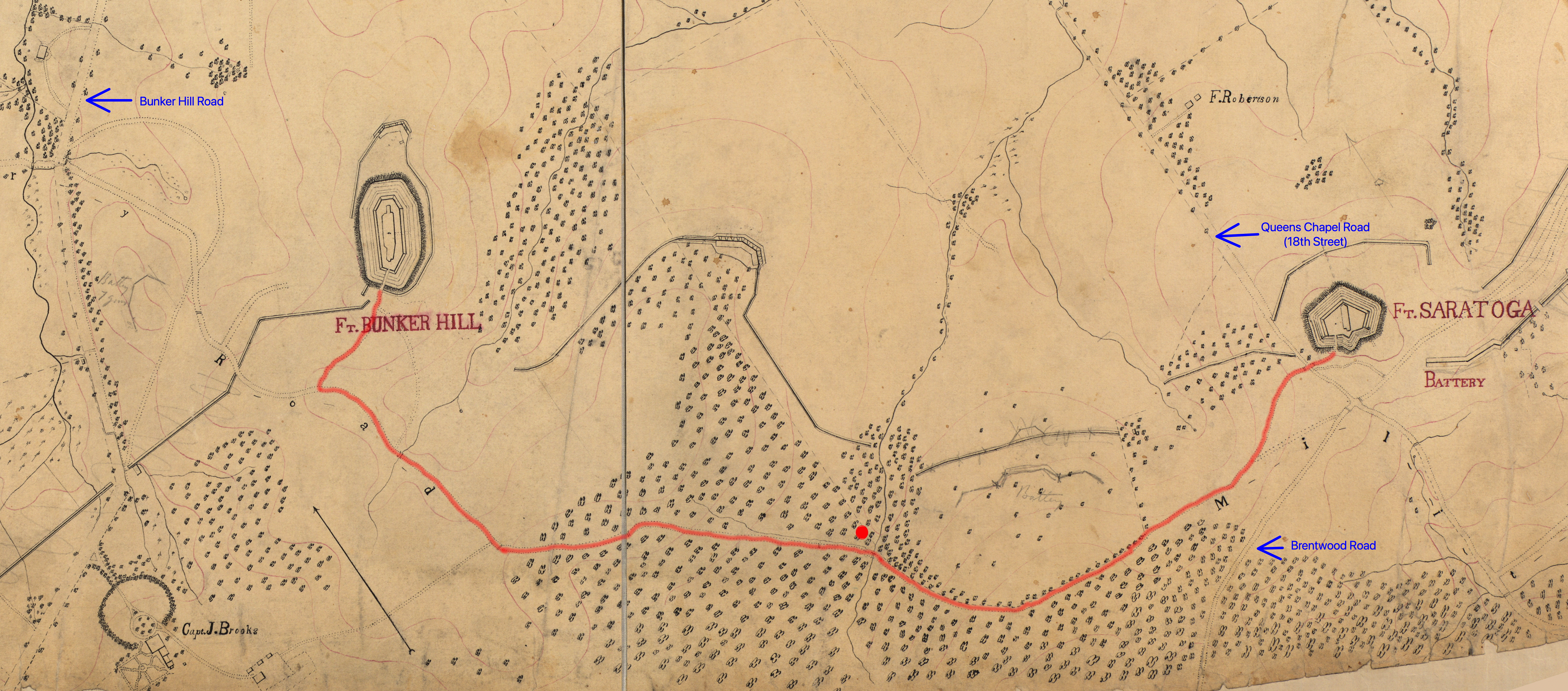 Powell, now on foot and hurting from the fall, realized he couldn’t stay on the roads. Army troops were alerted and beginning to patrol, as well as Metropolitan Police. So he made his way in the forested areas north of Boundary Road (Florida Avenue), which were numerous. He might have hidden in Mt. Olivet cemetery for the night, or might have pushed on further. The longer he took, the more soldiers were patrolling, and the ring of forts in this section of Washington would be difficult to get past. According to reports after he was captured, he spent two nights hiding in various trees, sometimes close enough to hear soldiers’ conversations as they walked below. Although there were many confederate sympathizers in this part of town, including the Brooks and Queen families, there is no record of him trying to contact anyone for help. At some point, probably early Sunday, he ditched his blood-stained coat near the road leading to Fort Bunker Hill.