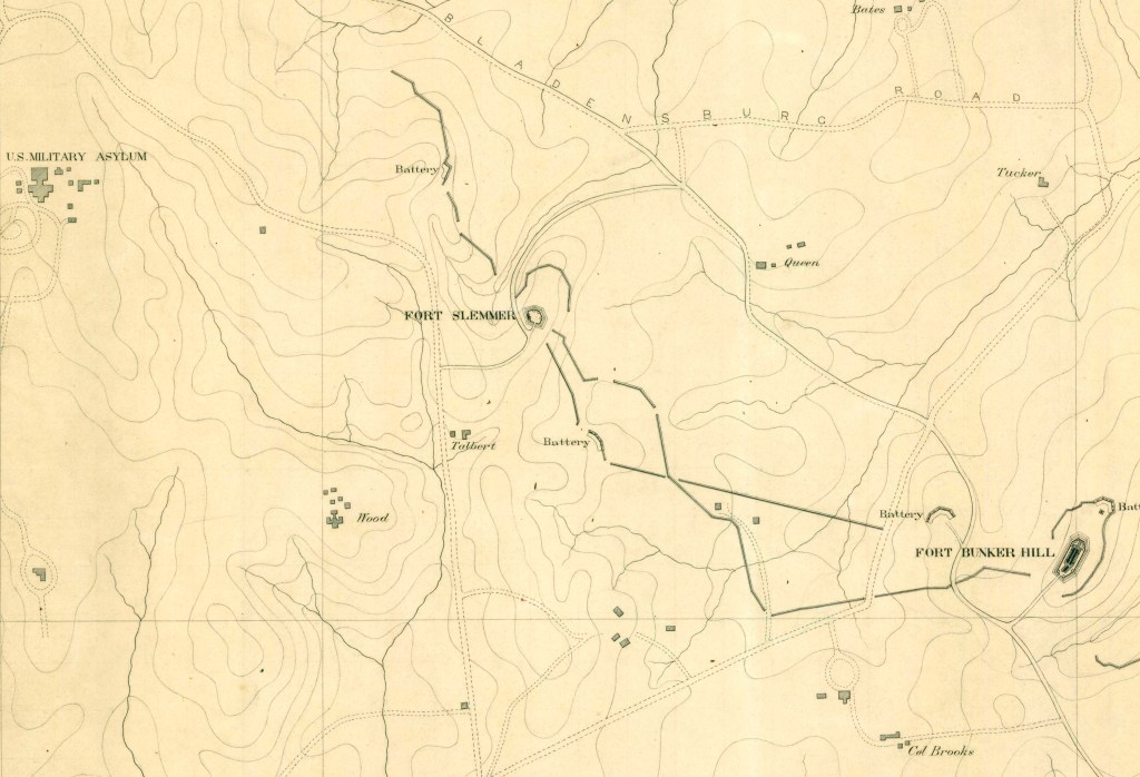 Hi, this is fascinating. Do you think the line extending across the photo about 1/4 up from the bottom is Georgetown/ Bladensburg Rd, later Bunker Hill Rd, now Michigan Ave? I thought it might be but the big tree on the far left side seems to be too close to Fort Bunker Hill. I also wonder what you make of the white building to the right of the soldiers home. Thanks for all of your hard work exploring such cool stuff.