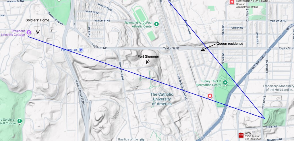 The Queen home was located at today’s 8th and Taylor Streets, in the Turkey Thicket apartment complex. I think the photo matches up pretty well with the above map as well as the map prepared by John G. Barnard, chief engineer of the Military District of Washington: