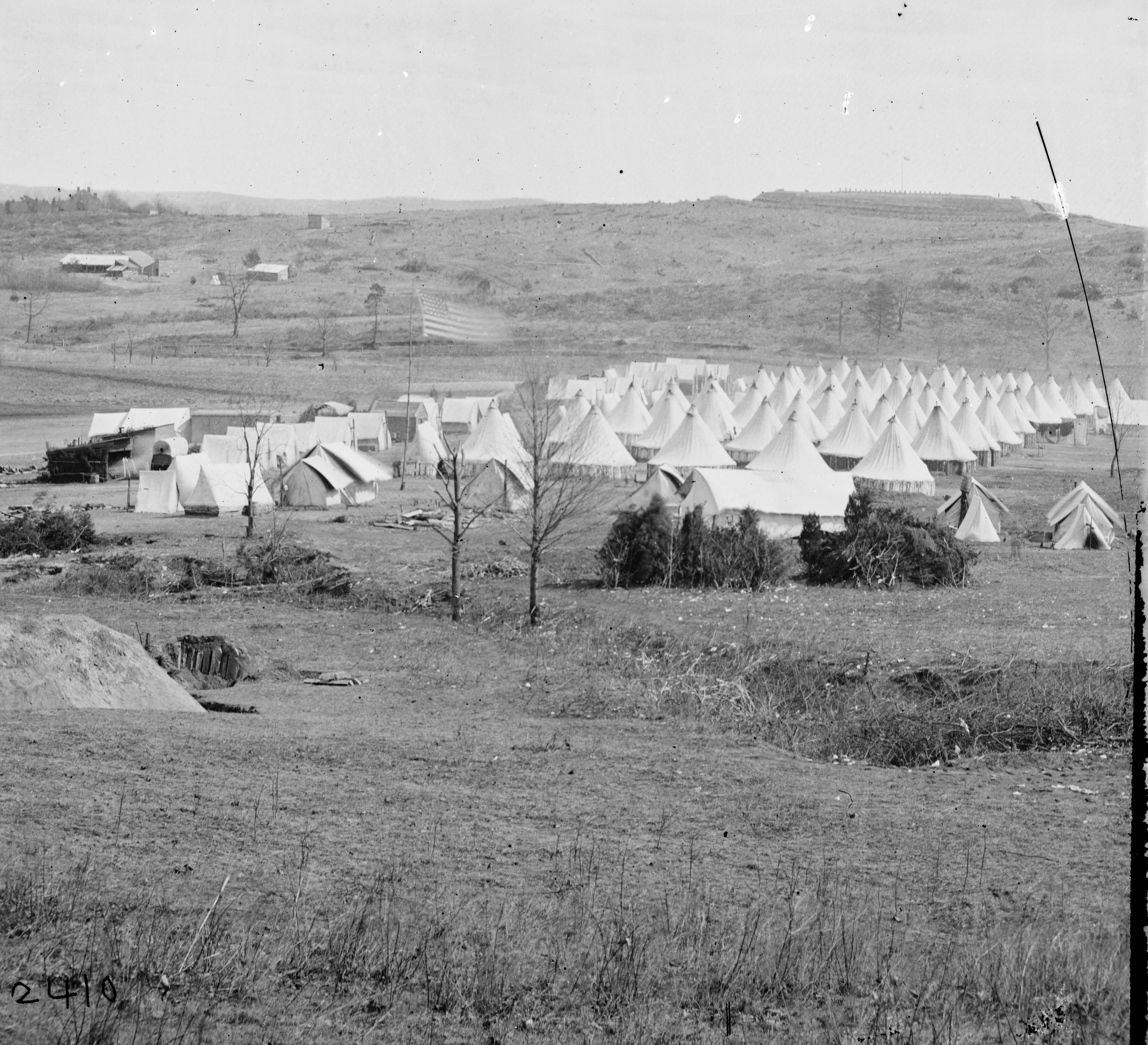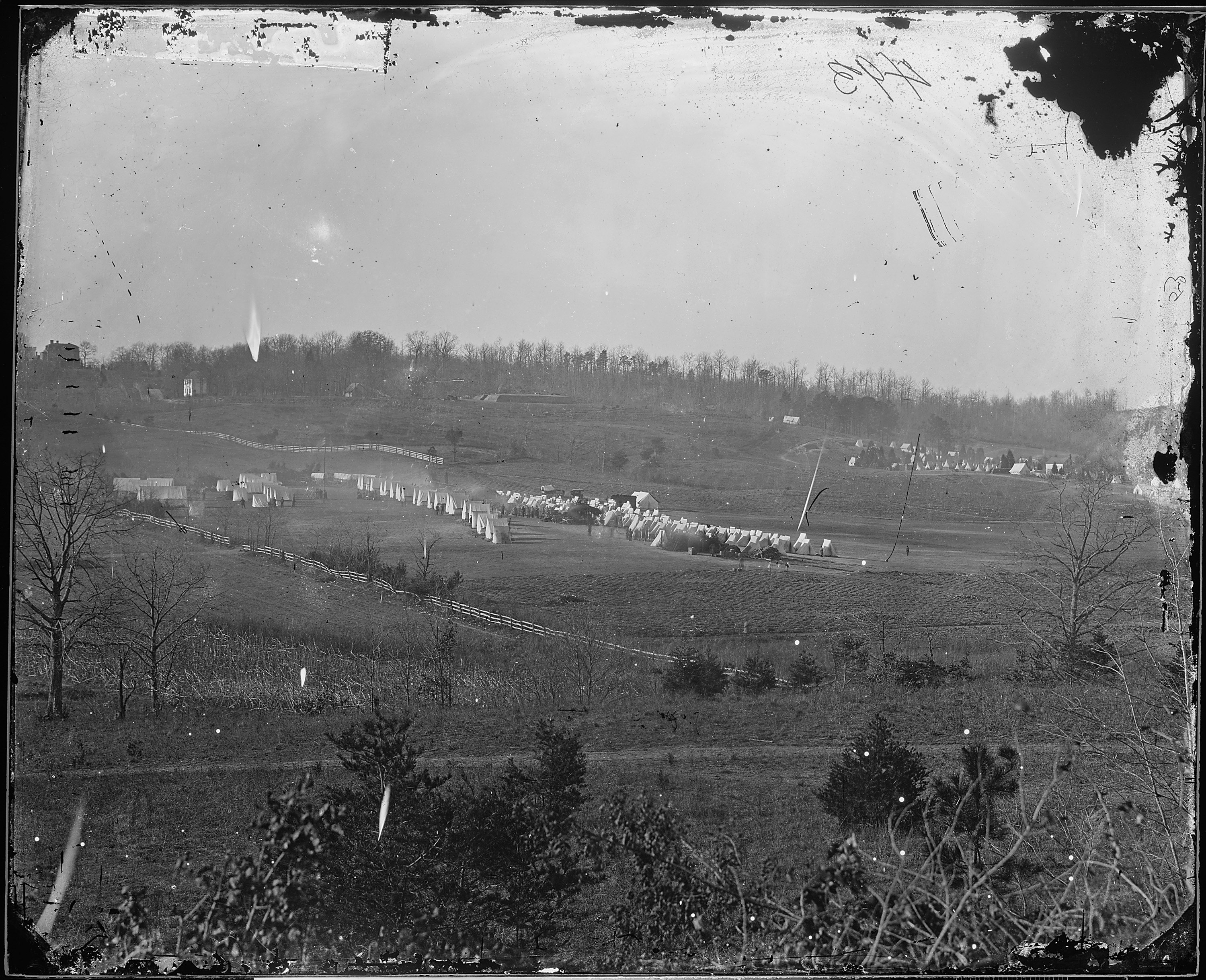 It was labeled “Camp of 31st Regt. Pa. Vols. hdq. General Graham’s Brigade.” I remembered from my research on Fort Bunker Hill that the brigade camped on Queen’s farm was known as Graham’s Brigade, and included the 23rd and 31st Pennsylvania, and the 65th and 67th New York regiments. Excited, I started to examine the photo closely and then saw, scratched into the image along the bottom, the word “Murfreesboro,” a city in Tennessee. I assumed I had been wrong and didn’t research the photo any further. A few years went by until one day I was scanning through the National Archives Flickr page when I came across what appeared to be a print from the original negative. It was much more expansive, and didn’t have Murfreesboro etched into it.