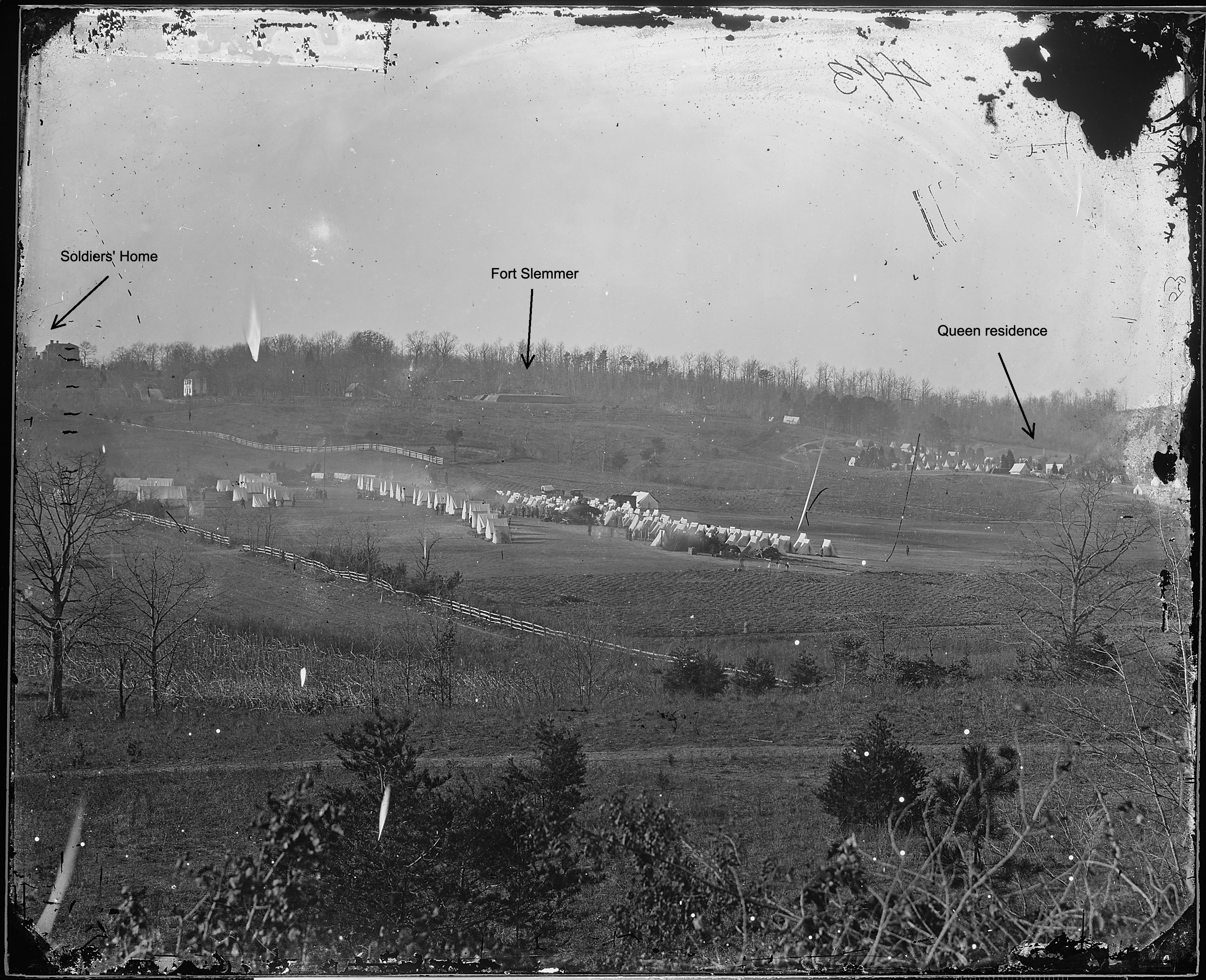 If the camera was perched on the slopes of Bunker Hill, maybe the parapet of the fort itself, pointing northwest toward Fort Slemmer, I believe both the Soldiers’ Home and the Queen residence line up very well. I overlaid the camera’s view on a modern map.