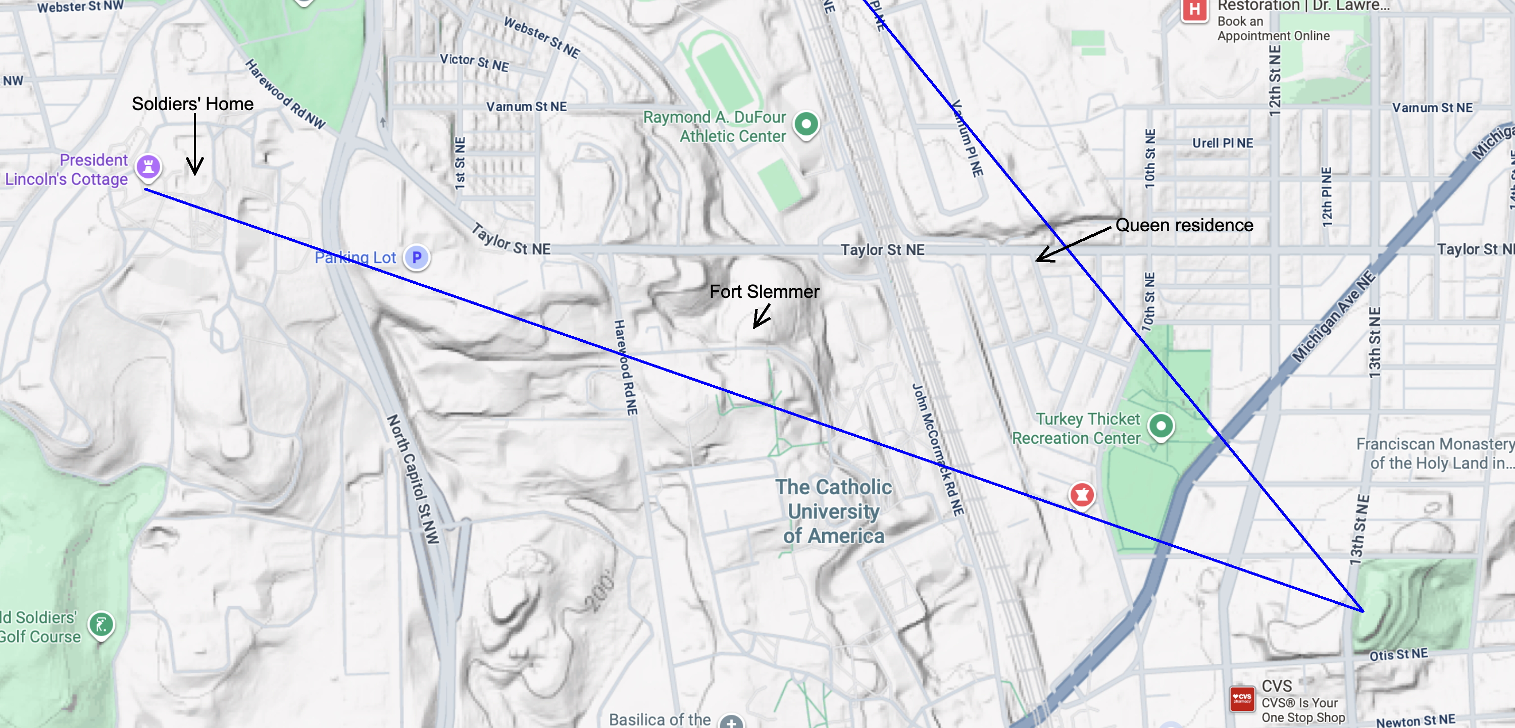 The Queen home was located at today’s 8th and Taylor Streets, in the Turkey Thicket apartment complex. I think the photo matches up pretty well with the above map as well as the map prepared by John G. Barnard, chief engineer of the Military District of Washington: